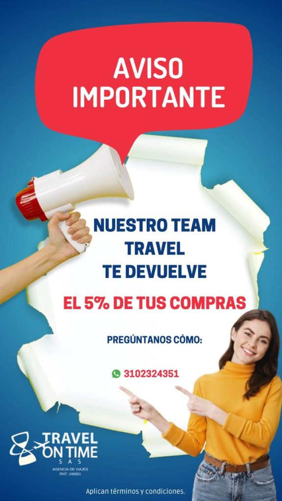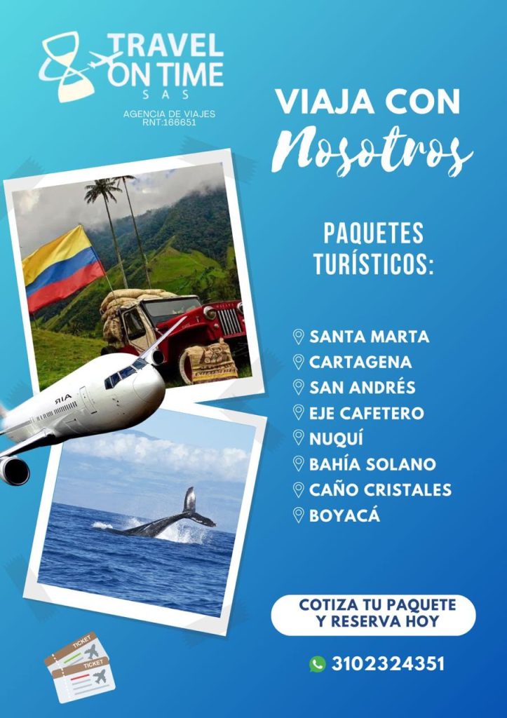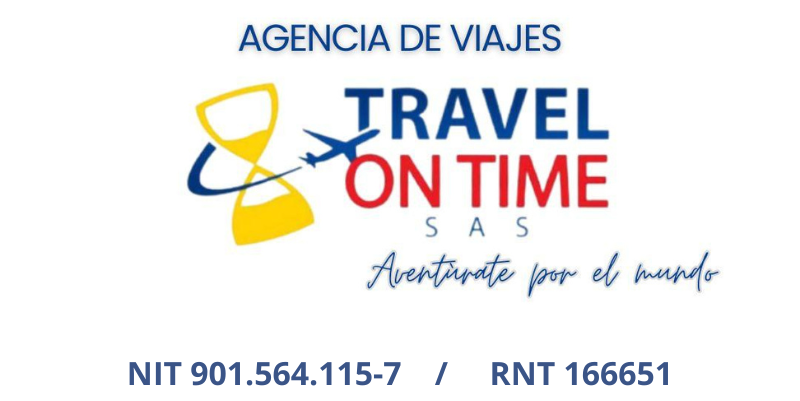 TRAVEL ON TIME SAS es una empresa con más de 5 años en el sector, que se dedica a organizar y gestionar viajes con una razón social por Colombia. Ofrecemos una amplia gama de servicios como: venta de tiquetes aéreos, hoteles, organización de excursiones, y la gestión de paquetes turísticos personalizados, entre otros.